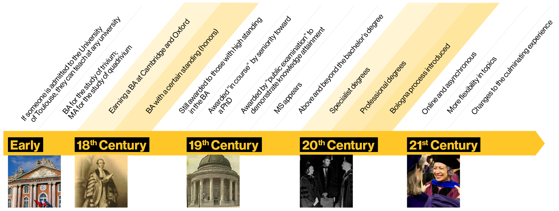 The master’s degree has roots in Europe and early North America and has evolved over the centuries. It dates to the Middle Ages when the first-known master’s degrees were awarded to individuals who studied both the trivium (grammar, rhetoric and logic) followed by the quadrivium (arithmetic, geometry, astronomy and music), which together encompassed the seven liberal arts. Students followed this path presumably for similar reasons as they do now – their career path required it, and they wanted to attain higher knowledge and stature. Earning a master’s degree (quadrivium) enabled one to teach at other European universities. By the 18th century, the master’s degree was simultaneously awarded with a bachelor’s degree from Oxford or Cambridge. The bachelor’s degrees from Oxford or Cambridge were considered superior and thus given a higher distinction. Other institutions in England subsequently awarded master’s degrees to students earning honors during their bachelor’s degree program.