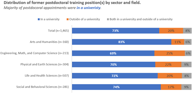 Sector of Postdoctoral Appointments. A large majority (73%) of the survey participants (n=1,465) held their postdoctoral appointments at a university, while some held postdocs at some other type of institution or entity (20%), and a few held postdocs both in a university and outside of a university (8%). This was true across different broad fields of study (Figure 1).