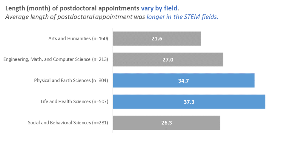 Length of Postdoctoral Appointments. The length of the postdoctoral appointment varied by broad field of study. The average length of postdoctoral appointments was longer in Life and Health Sciences (37.3 months) and Physical and Earth Sciences (34.7 months), compared to Engineering, Math, and Computer Science (27.0 months), Social and Behavioral Sciences (26.3 months), and Arts and Humanities (21.6 months) (Figure 2).