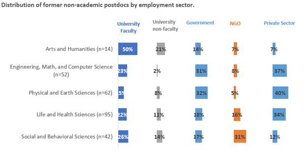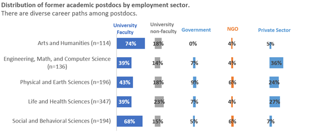 Diverse Career Pathways. Not all former postdocs at universities subsequently went on to faculty positions. For postdocs in STEM fields, a large percentage were working in industry at the time of participation in this study: 36% of postdocs in Engineering, Math, and Computer Science and 27% in Life and Health Sciences worked in the private sector. In contrast, 74% of former Arts and Humanities postdocs at universities went on to become faculty members. Combined with those who worked as administrators and staff at the time of survey participation, 92% of Arts and Humanities who had held university postdocs later went on to jobs in the postsecondary sector. A small number of Arts and Humanities postdocs were employed in the non-profit and private sectors (4% and 5%, respectively) (Figure 3). In contrast, those who held non-university postdoctoral appointments were more likely to go on to jobs in the non-academic sector (Figure 4).