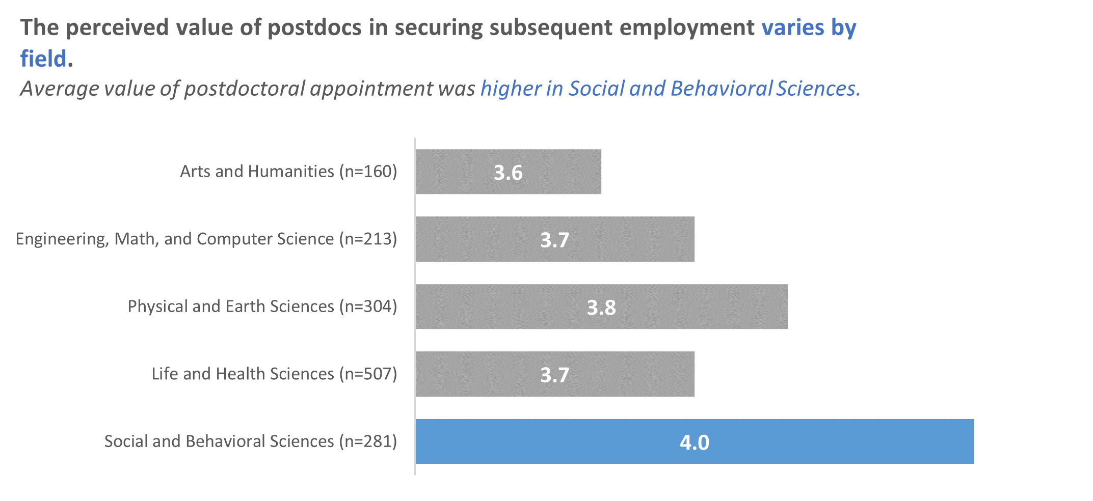 Perceived Value of a Postdoctoral Experience. When asked to rate the value of their postdocs in securing subsequent employment on a 5-point scale, from not valuable at all to extremely valuable, former postdoctoral associates recorded favorable views on how their experience helped them securing subsequent employment. Those with doctorates in Social and Behavioral Sciences had the most favorable views, with the average score of 4.0 out of 5 (Figure 5).