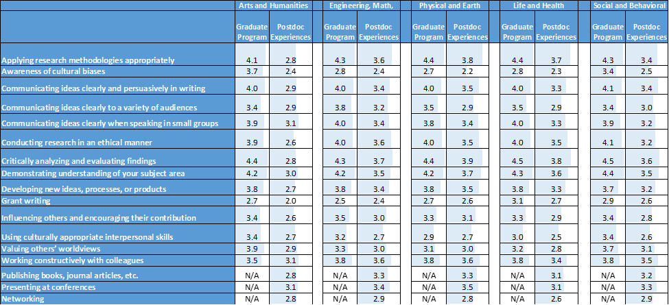 Preparation in specific skills. Participants were asked how well their graduate programs prepared them in specific knowledge and attributes in the baseline surveys and the same questions were asked about their postdoc experiences in the follow-up survey. To understand how postdocs experiences added to career preparation compared to graduate study, we compared the mean scores of skills preparedness between graduate programs and postdoc experience for participants who participated in both the baseline and follow-up survey. Across the board, former postdocs reported higher marks for professional development opportunities during their doctoral studies than in their postdoctoral experiences. Moreover, respondents across all fields reported less postdoctoral preparation in specific skills and attributes such as grant writing, networking, and awareness of cultural values and biases and using culturally appropriate interpersonal skills (Table 1).
