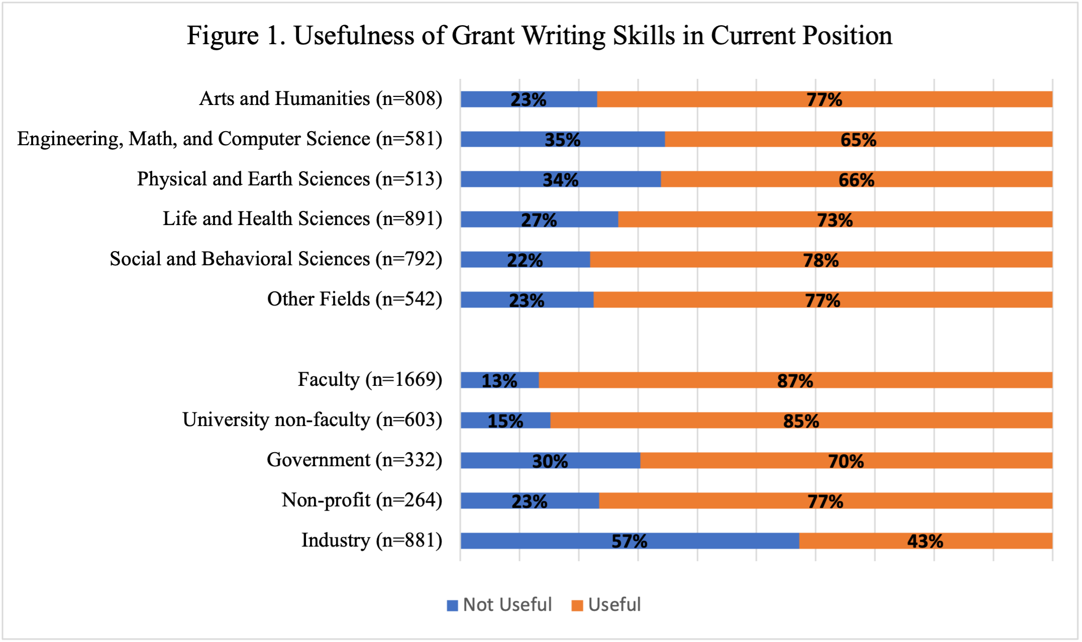 Usefulness of Grant Writing. Within each broad PhD field of study, most PhD alumni found professional development in grant writing to be useful. Across fields of study and all job sectors, except for industry, the majority of PhDs report- ed that preparation in grant writing was useful (Figure 1). Figure 1 displays the percentage of participants by job type and discipline who indicated that grant writing skills were or were not useful in their current position.