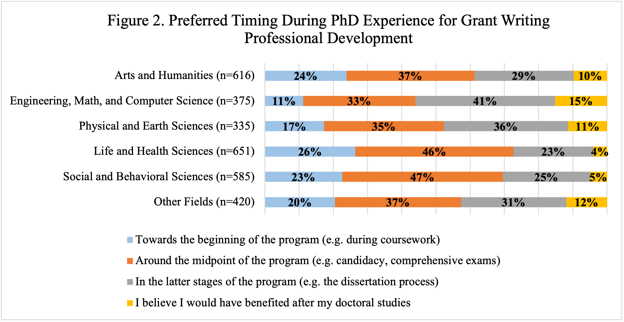 Timing for Grant Writing Preparation. Survey results show that the percentage of PhDs with Engineering, Math, & Computer Science (41%) and Physical & Earth Science (36%) degree fields preferred grant writing preparation to occur during the latter stages of the program (e.g., dissertation process). The remaining fields indicated that this preparation should occur during the midpoint of their degree field (e.g. candidacy and comprehensive exams). Doctoral fellowships and research grant opportunities are typically available for PhD candidates. This interest in grant writing in the middle and later stages of the PhD coincides with students’ eligibility to apply for grants and fellowships to fund doctoral studies as well as independent and group research. In addition, by midpoint, PhDs have solidified their research topic. Furthermore, securing funding for research enhances a PhD’s opportunity to secure employment in a competitive job market (Figure 2).