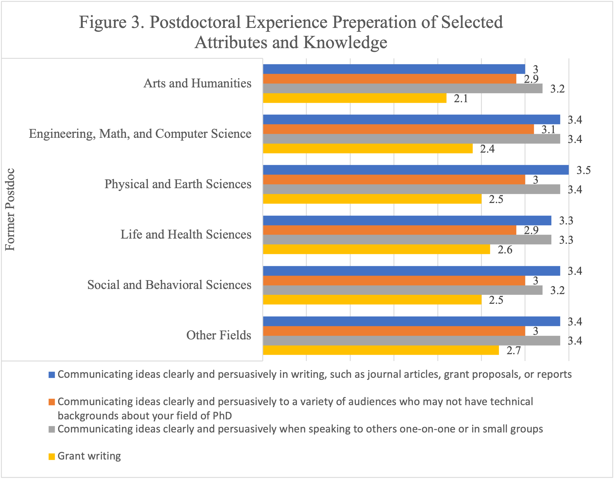 Postdoc Preparation for Communication and Grant Writing. Many PhDs choose to further their knowledge and experience in research and writing through postdoctoral work. Participants who had had postdoc experiences were asked how well their postdoctoral experiences prepared them in selected attributes and knowledge on a 5-point scale (1=Poorly to 5=extremely well). Across all fields of study, previous postdocs indicated that they were less prepared for grant writing through their postdoc experiences than they were in skills such as written and oral communication. Specifically, of the communication skills presented, survey respondents with postdoctoral experiences indicated that they felt more prepared by their experiences for written communication skills and small group/interpersonal communication skills than they did for grant writing (Figure 3).